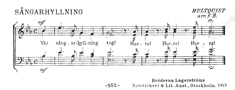En klassiker bland tusentals körsångare runt om i Sverige är den korta och koncisa sångarhyllning Filip Bengtsson arrangerade. Återfinns som 455 b bland Sångens notbilagor. Text, möjligen melodi, av ”Hultquist”, dvs Gustaf Hultquist (dirigent bl a i Svenska Sångarförbundet och Norrlands sångarförbund).